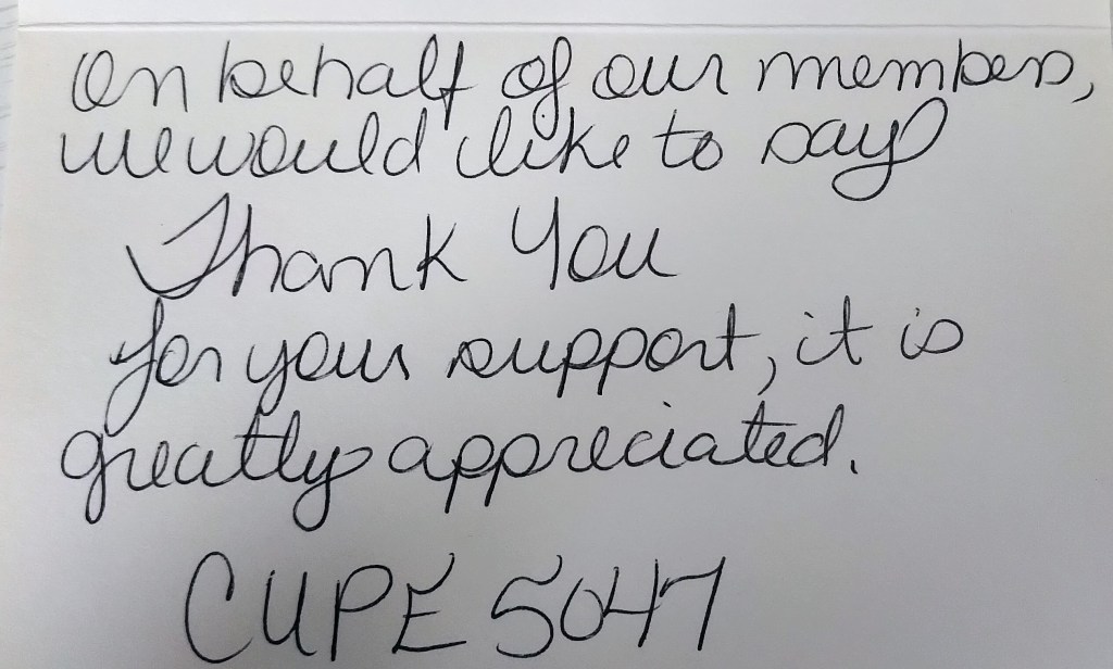 On Tuesday afternoon, Joan Clark and I got together to bake some cookies for the striking EPAs. For those of you not on Facebook, here are a couple of pictures from yesterday. And then a photo of a card I was given today (Wednesday) after dropping off the cookies and spending some time listening to the women and men who are on strike, those who enable some of our most vulnerable children to be in school, learning and socializing with their peers.
