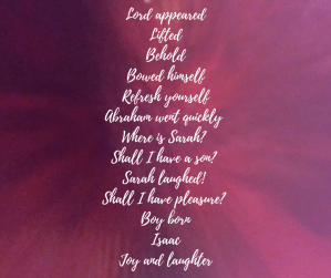And then there is promise, the Lord promises a child, born in Sarah and Abrahamās old age. I love the earthiness of this passage⦠not only is there food, drink and respite from the heat of the day offered. But Sarah speaks of she and Abraham being old, and not taking any sexual pleasure in each otherās bodyās any longer. I imagine her laugh is one of disbelief!