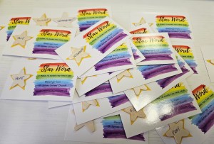 You may remember that last year on my first Sunday with you; you received a Star Word to ponder throughout the year; I’d be interested in whether you pondered yours at all. Mine was ‘feel’ and I think I’ll write a separate post about that. You’ll get a new star word this year and we are going to take it one step further. I’d like to know what your word is and perhaps check in with you about it in the coming year. Also, I’ve got lots of extra stars for you to take and give to a friend/neighbour/family member/co-worker. They are glued to business cards one this year.โI plan to take some out to some of the shops etc. in our area. WAY outside my comfort zone, but my motto is ‘If you’re not living on the edge, you’re taking up to much room!’ ๐