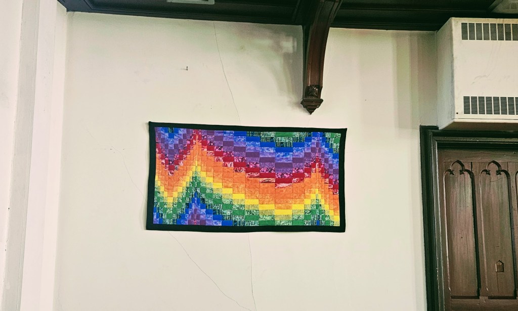 The beautiful banner we dedicated a couple of weeks ago has been hung in its temporary home at the back of the sanctuary; once a companion banner has been completed, they will both be hung in the entryway. A key visual expression of our Affirming presence.