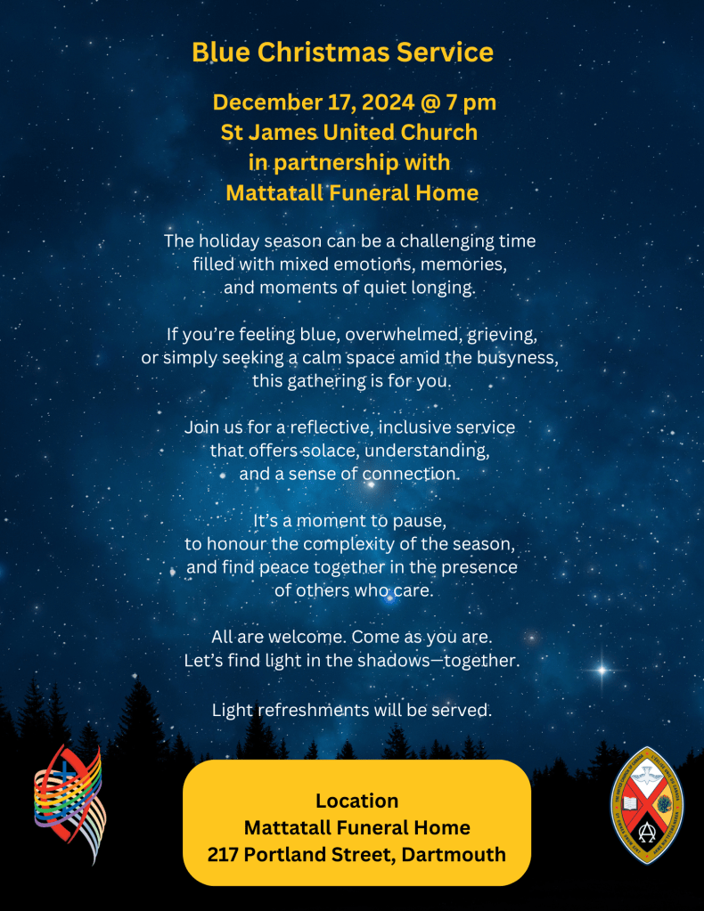 I referred to the loneliness epidemic earlier… if you’re finding this season challenging for any reason, come to the Blue Christmas Service we’re hosting at Mattatall Funeral Home on December 17th. Or if you’re not having a difficult time, but know someone who is, invite them, offer to pick them up and go with them.