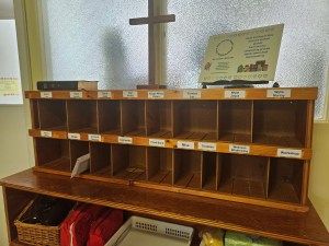 I’ve been racking my brains trying to think of something we can use for mail, especially when not all people have access to the office. While I was clearing out the Worship Supply room, I came across this unit that had been taken out of the sanctuary as part of the general decluttering. And thought to myself, “I bet that would fit on top of the bookshelf outside of Cathy’s office!” And sure enough it did. So there are slots for each member of the Leadership Team, as well as some groups/teams/committee.