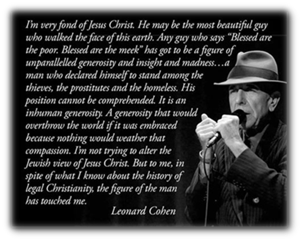 Some folks have wondered why I connecting Leonard Cohen’s music, a Jewish man and our scriptures. Well, for one thing, over half of our scriptures are from the Jewish Bible and below is a quote from Leonard himself.