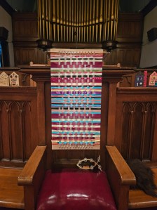 Remember last year when we wove prayers with ribbon during worship during one of the worship series we did? Well, I finally finished off the sides and we’ll use it as our pulpit hanging for the next little while. It will be a visible reminder of how we are woven together in prayer.