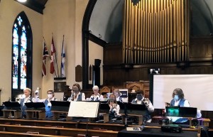 Each year the choir plays three or four times during morning worship services and at various other congregational events. It has been invited to play at other congregations, some local and some requiring considerable travel. (The farthest distance travelled was Bermuda!) During the Christmas season the choir plays at local assisted living facilities.